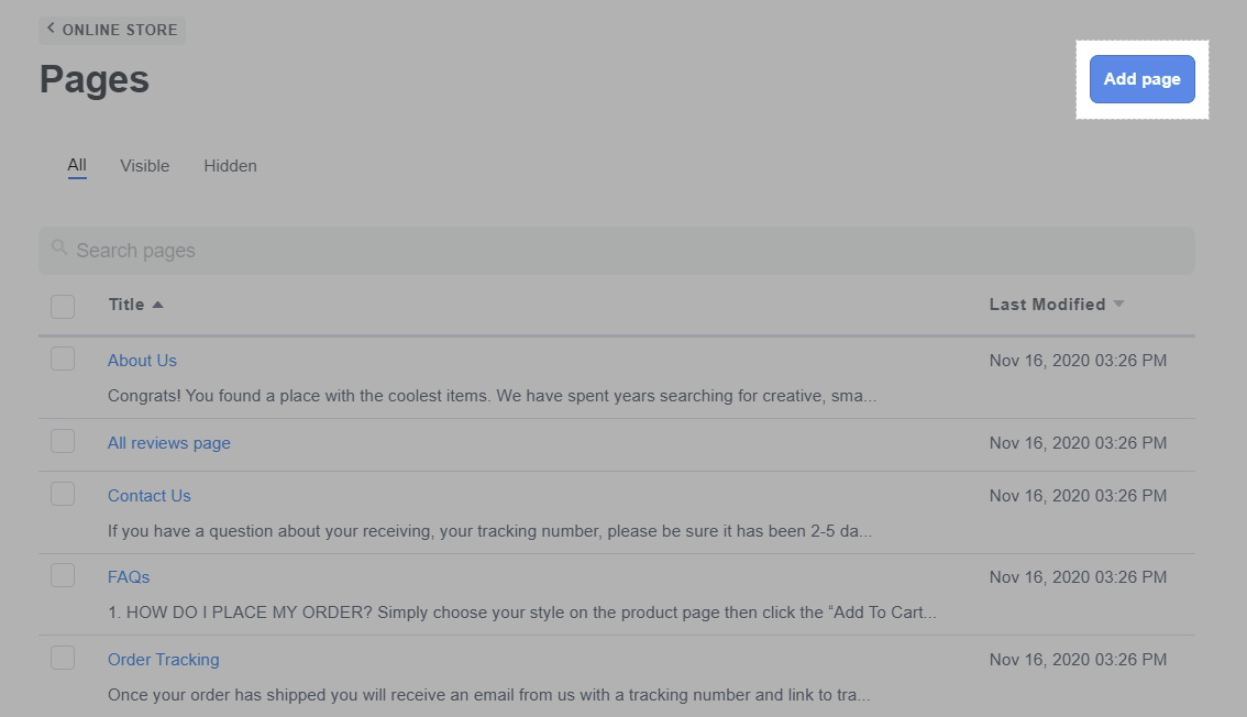 From your ShopBase admin site, go to Online Store > Pages > select Add Page.
