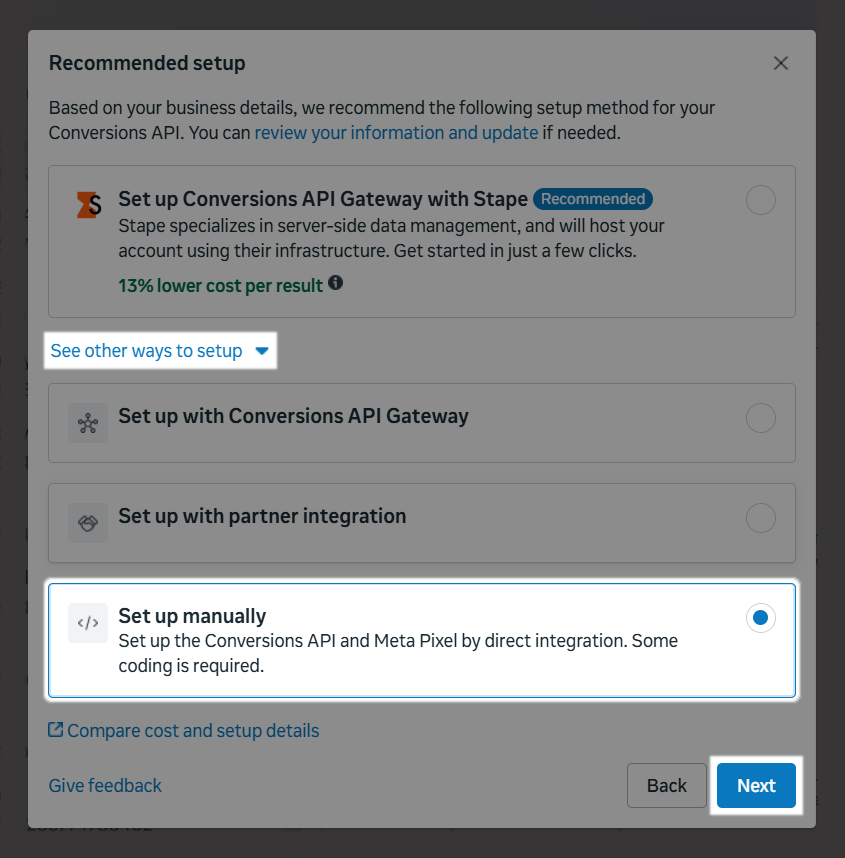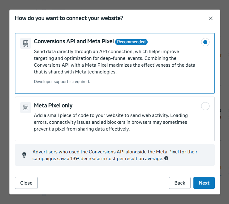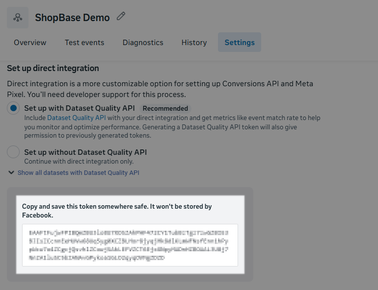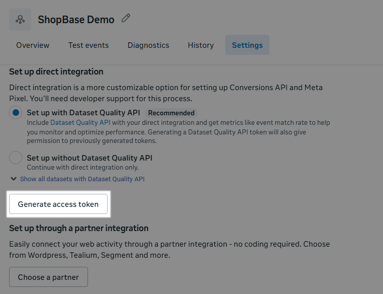 Conversions API works simultaneously with Facebook Pixel to optimize the efficiency of your Facebook ads by sending events directly from server to Facebook. These server events are attached to a specific Facebook Pixel. To set it up, you need to generate an Access token for the previously created Pixel.