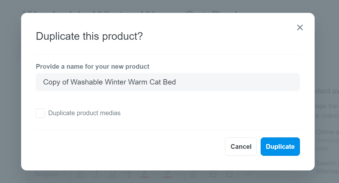 Enter a name for the duplicate product, select Duplicate product medias if you want the new product share the similar images/videos to the old one. Then click Duplicate.