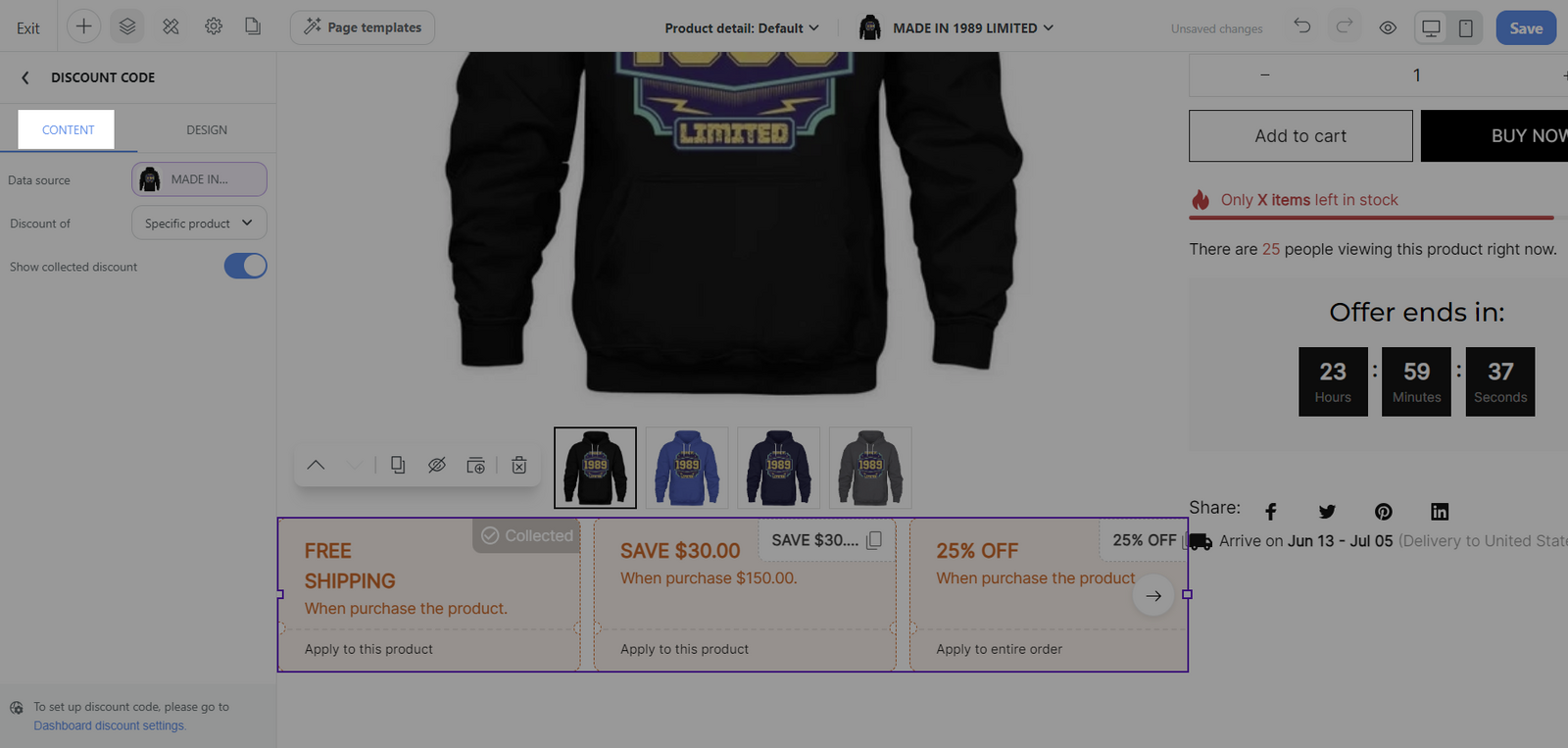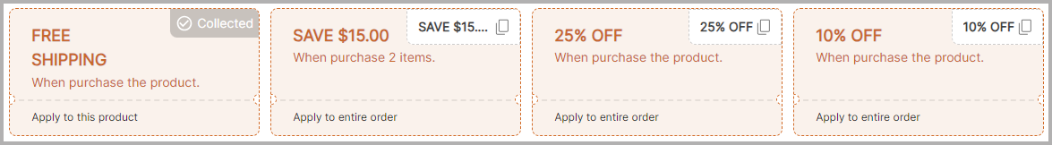 Current page product: Select this option to show discount codes applicable to the product being viewed on the current page. This means that the displayed discounts will change depending on the product page the customer is currently viewing.