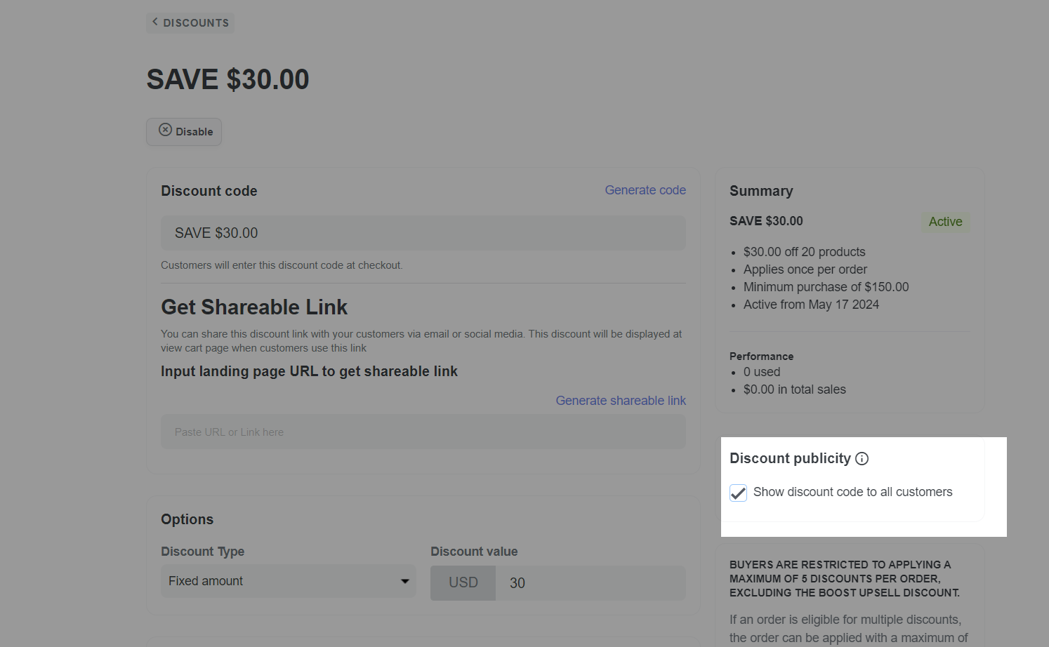 In the Discount publicity section, tick the option Show discount code to all customers to make the discount code visible to everyone or untick to keep the discount code hidden from public view.