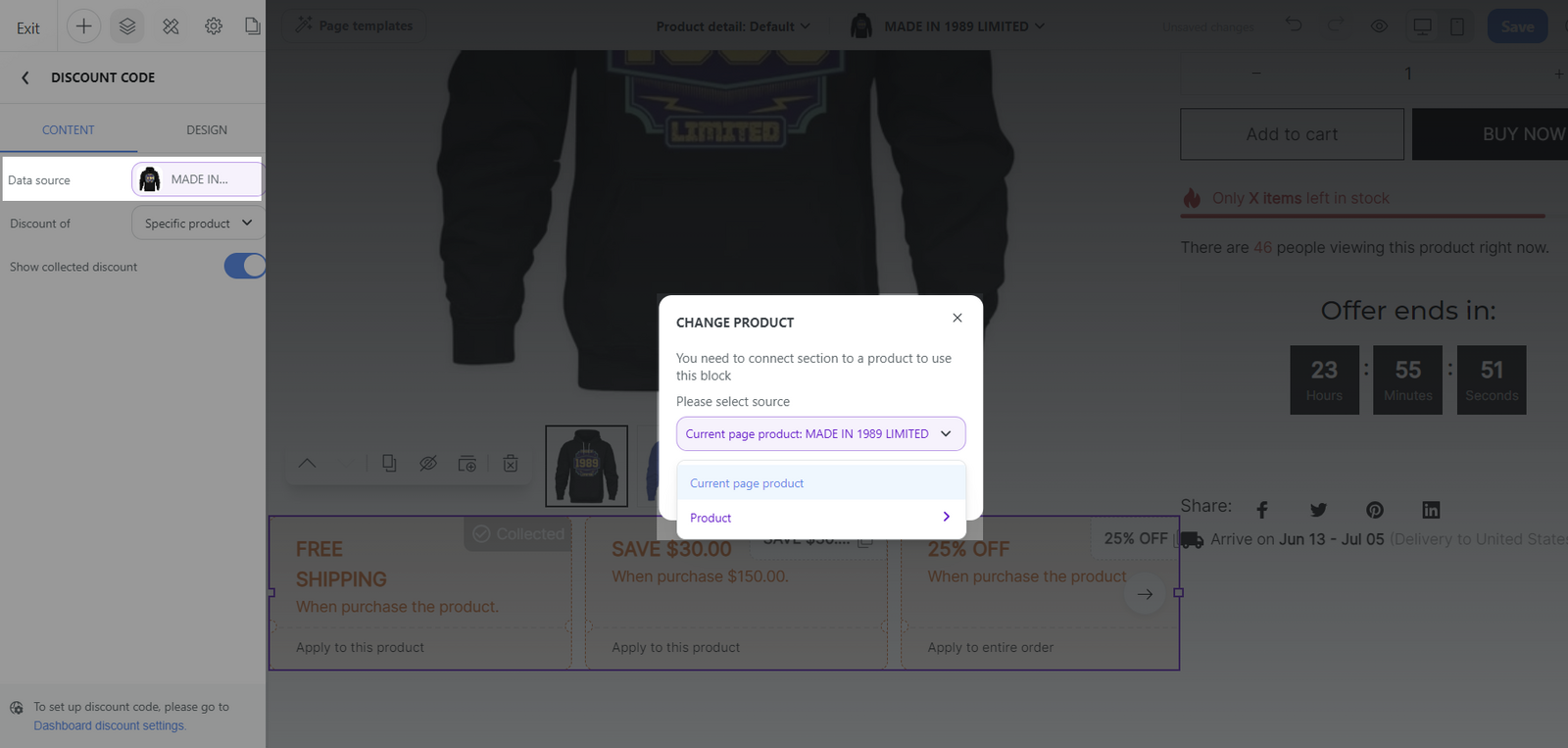 Data source: This setting allows you to choose which product’s discount codes to display in the discount code block:
