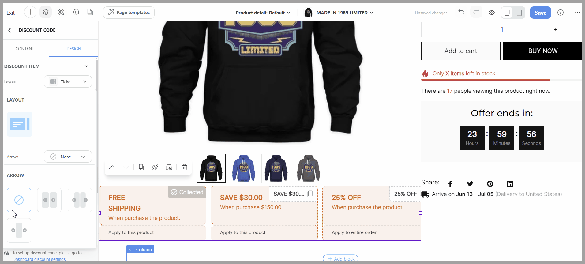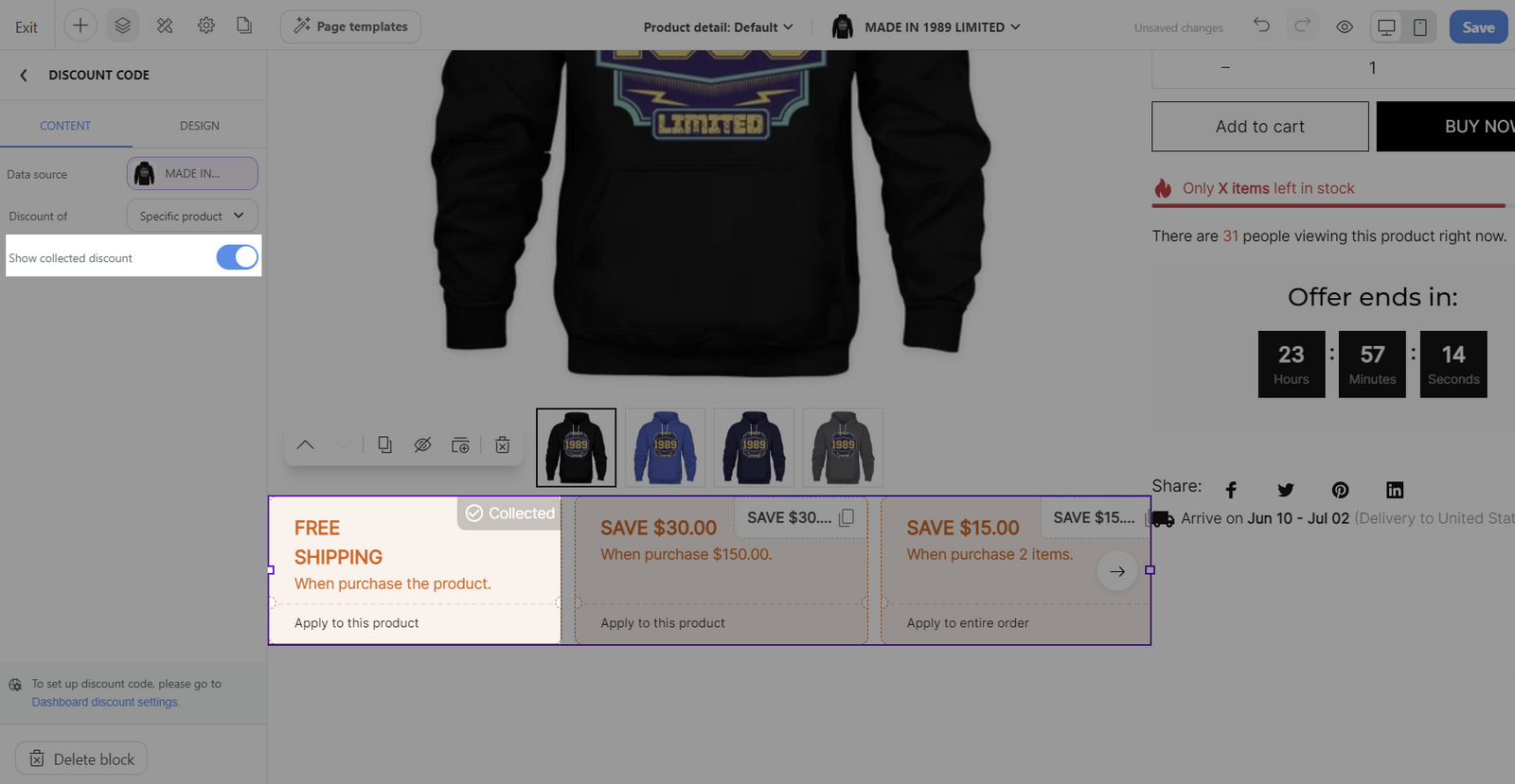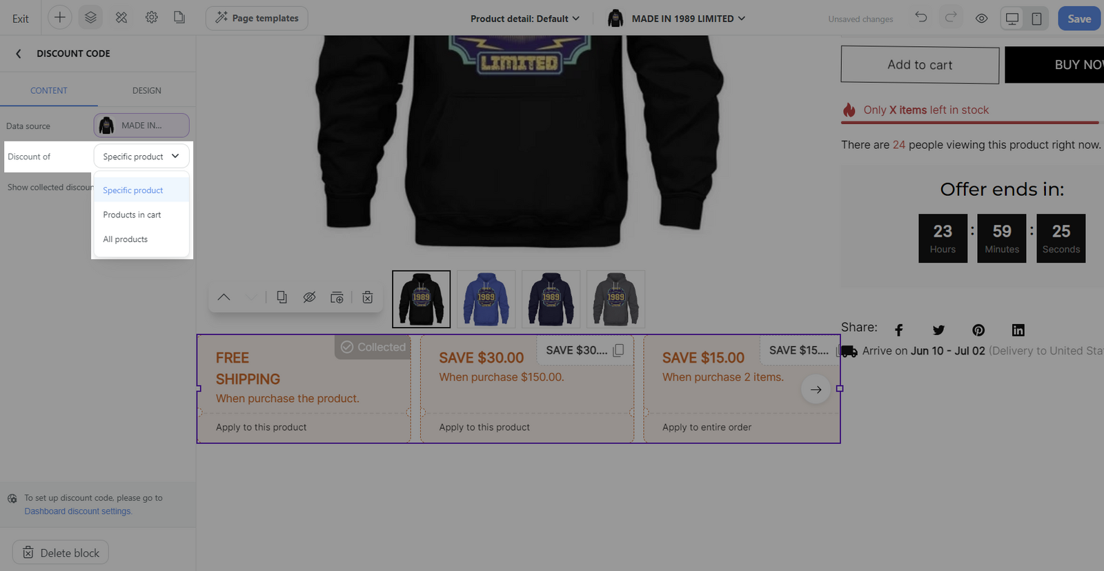 Discount of: This setting is crucial for determining which discounts to display in the block, based on the page where the block is placed. There are three choices: