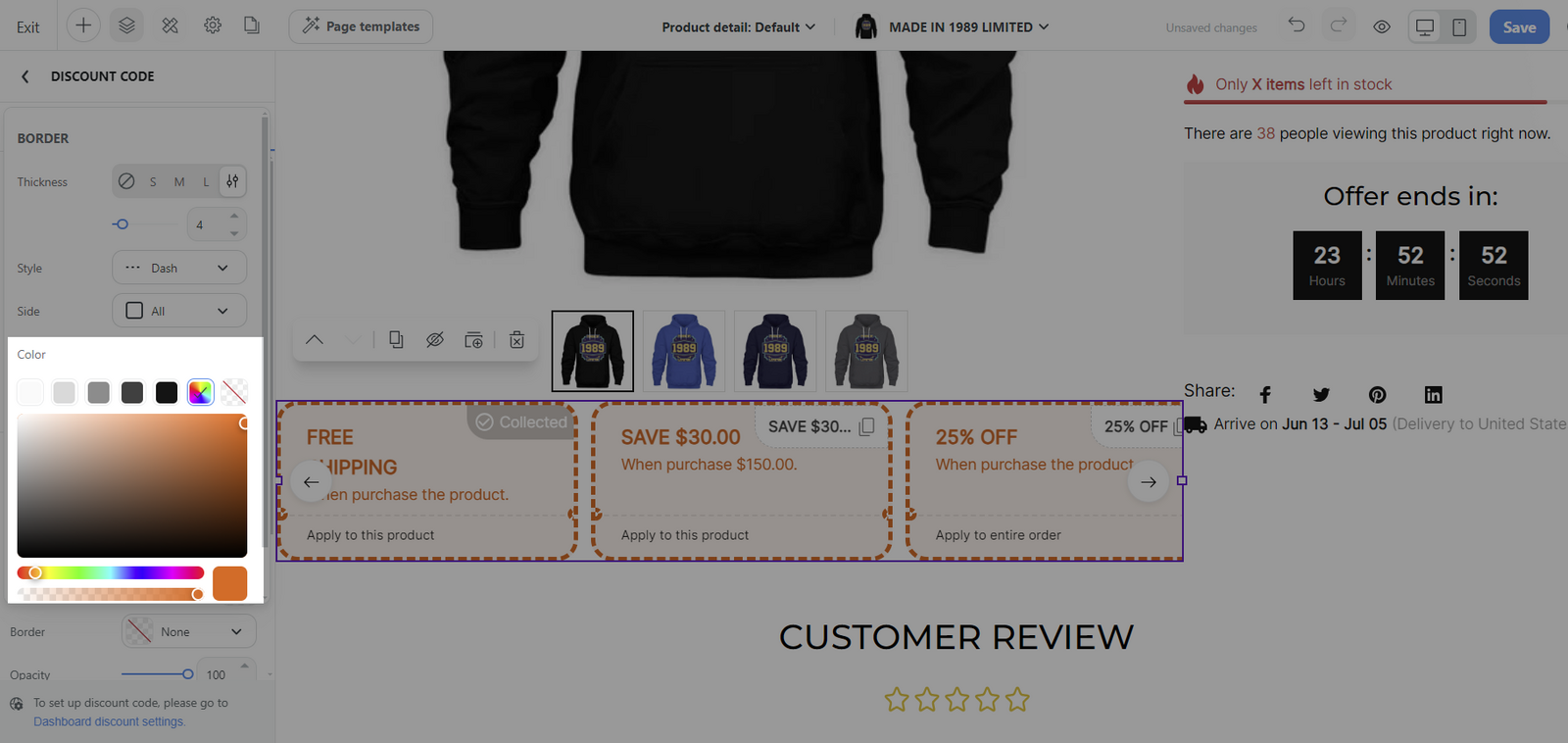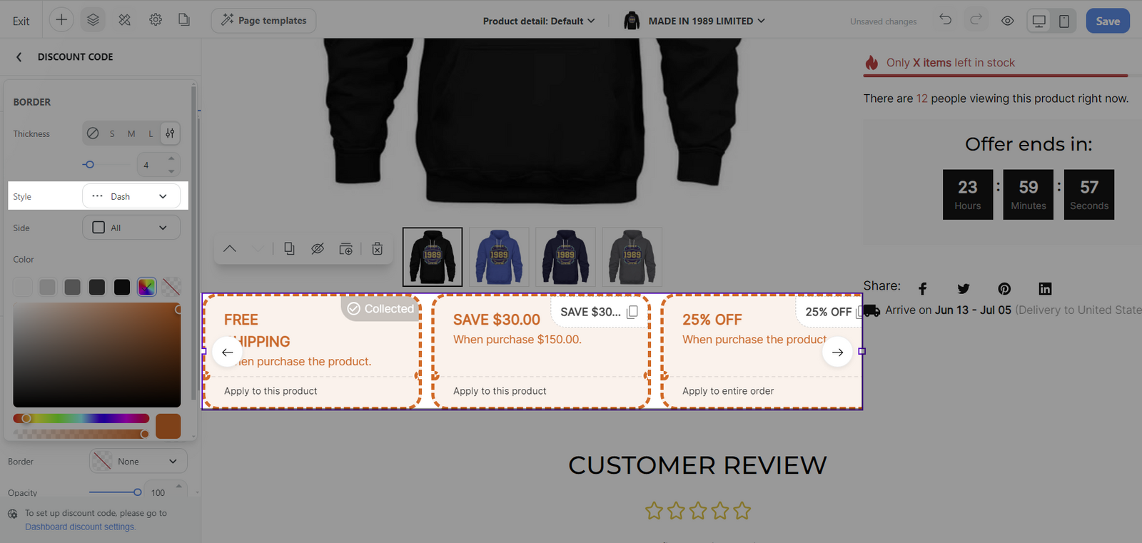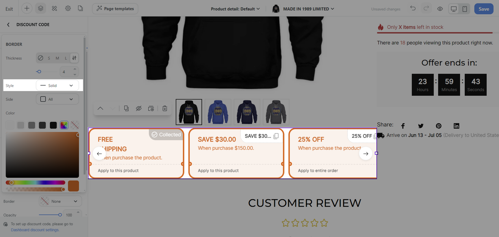 Color: Allows you to select a specific color for the border, which should coordinate with the overall design to frame the discount attractively.