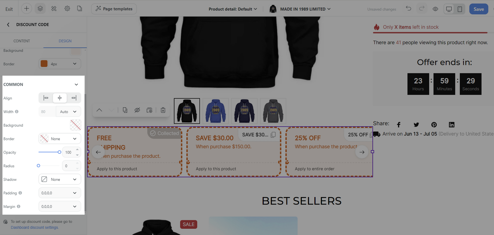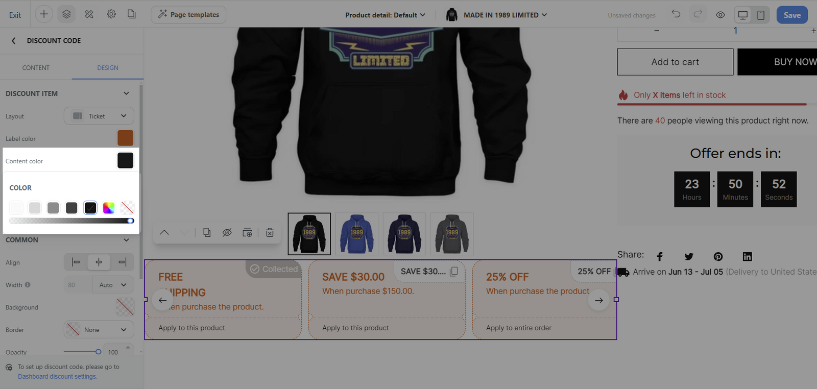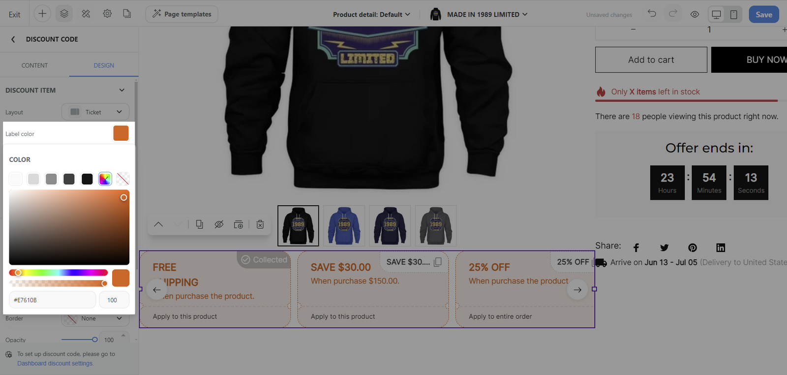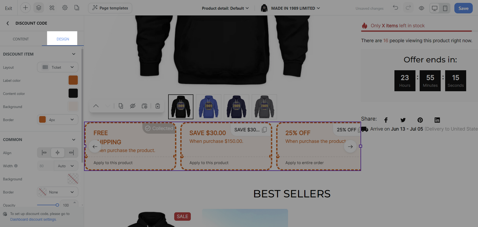 Color: Allows you to select a specific color for the border, which should coordinate with the overall design to frame the discount attractively.