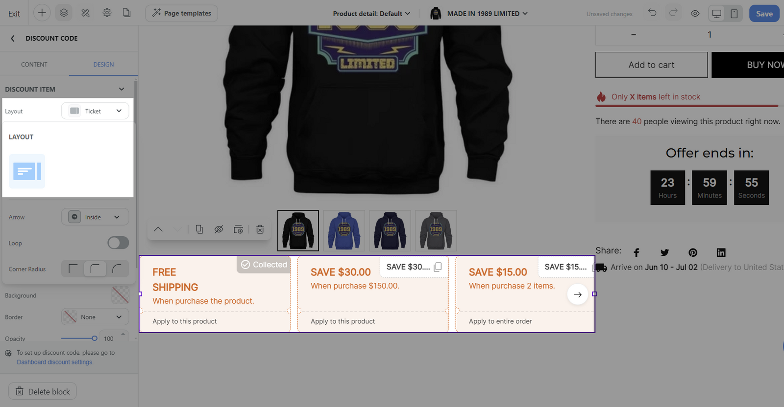 Layout: Ticket - emulates the appearance of a traditional coupon, making the discount presentation immediately recognizable and appealing.