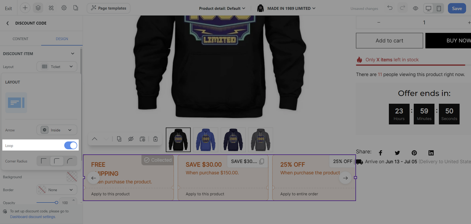 Loop: When enabled, the discount codes will loop back to the beginning after the last discount has been displayed.