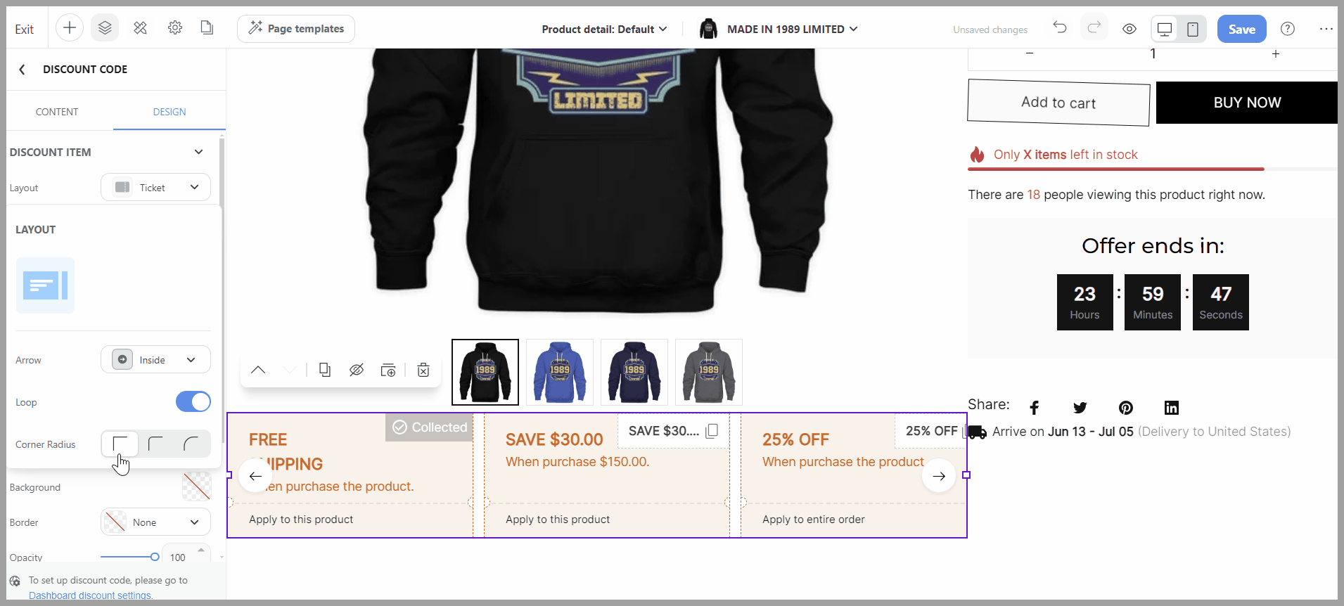 Corner radius: Adjusts the curvature of the discount item's corners. Options typically include: Sharp, Smooth, and Rounded.