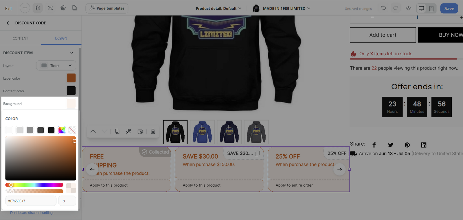 Background: Determines the background color of the entire discount item. This should contrast well with the text for readability and align with your brand’s color scheme.