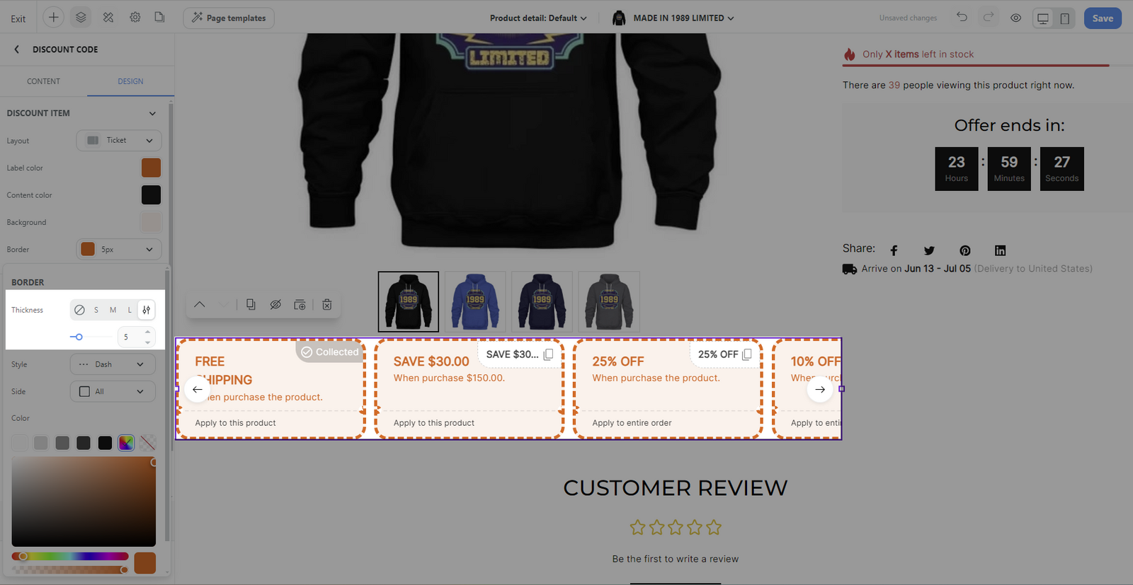 Thickness: Modifies the width of the discount item's border, with options ranging from: None (No border), S (Small - 1px), M (Medium - 4px), L (Large - 10px), Custom (Allows for a specific thickness to be input for unique designs.)
