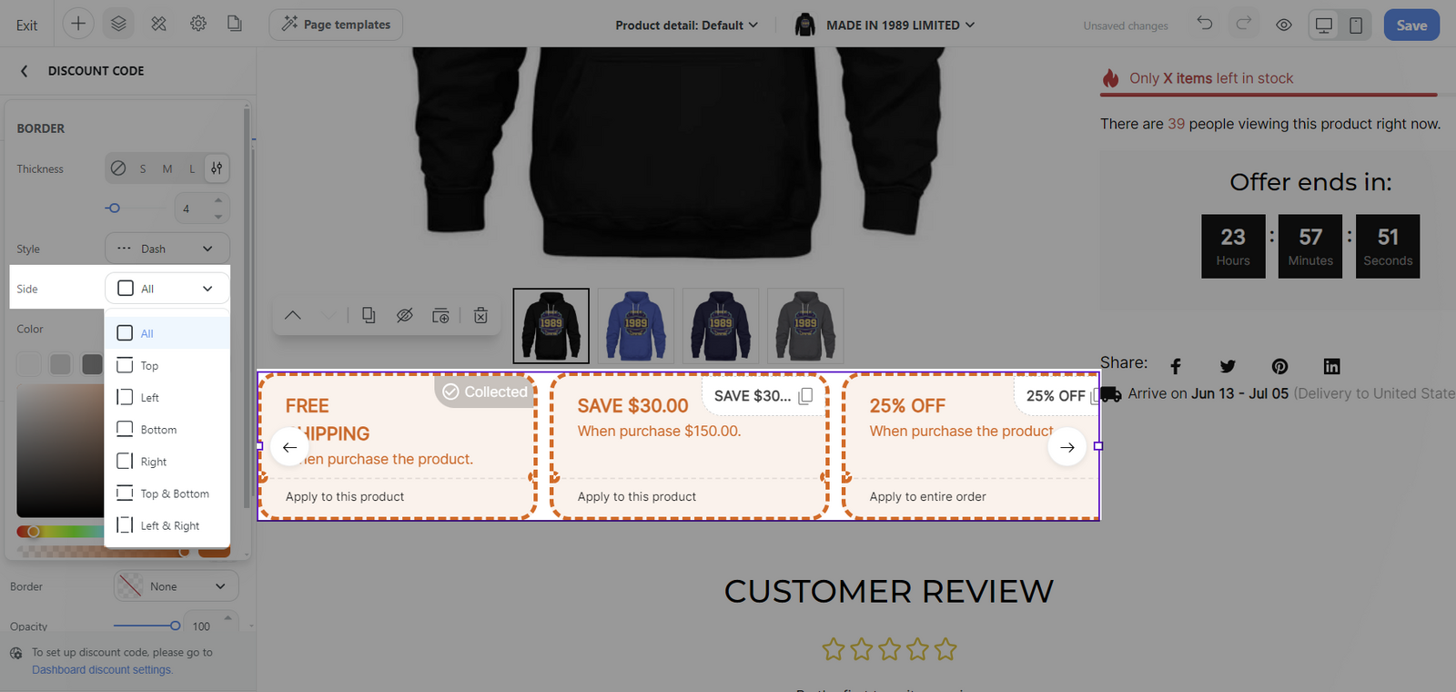 Side: Indicates which sides of the discount item will have a border: All, top, left, bottom, right, top & bottom, and left & right.