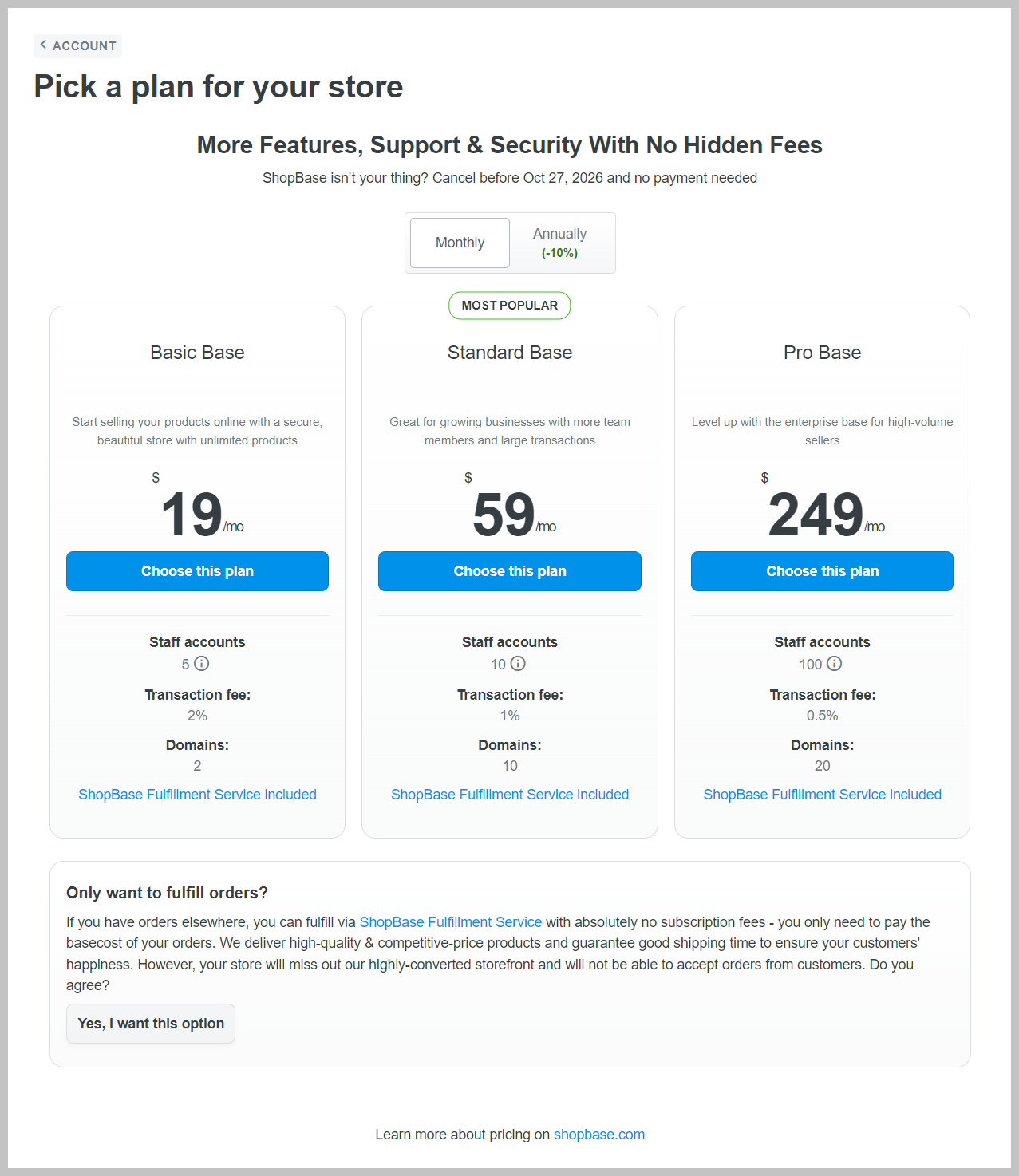 We offer you 3 different packages that meet your personal need here in ShopBase's pricing plan.