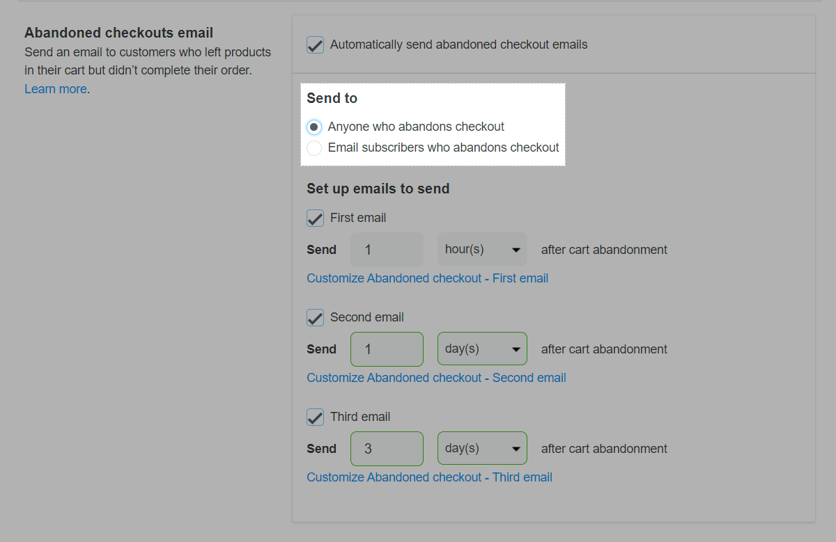 In the Send to section, choose one of two options: Anyone who abandons checkout or Email subscribers who abandons checkout.