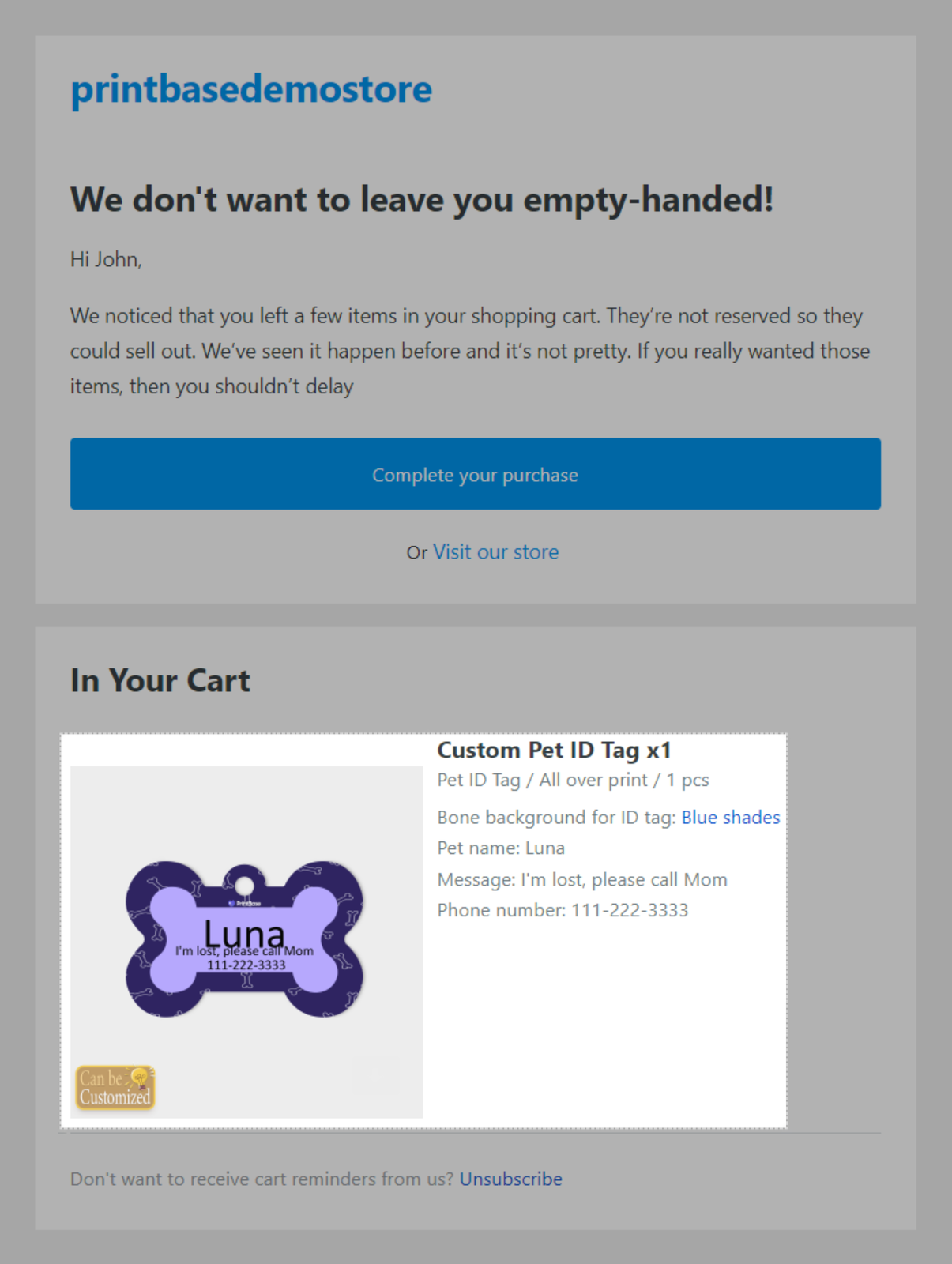 The product in the abandoned checkout order is in a personalized campaign created since October 07, 2021 on PrintBase or PrintHub app.