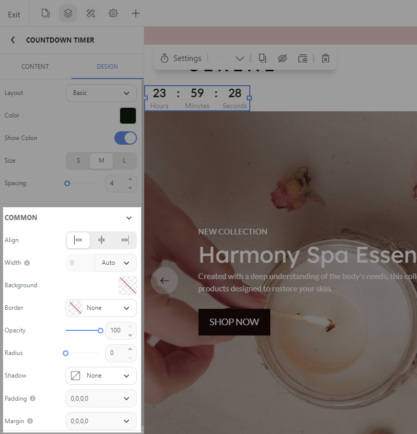 Custom: Enter a certain number of hour and minute for the countdown. You can also set up for the countdown to restart when the page is loaded or the countdown ends.