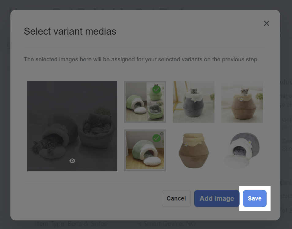 You can also click on the variant image in the Product detail page to choose or upload images for your product variant. The steps for selecting variant images are the same as step 4 above. However, you cannot rearrange images in this step.