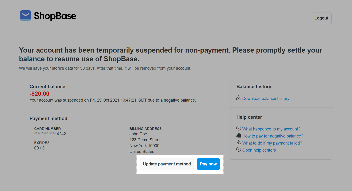 ShopBase Balance is a credit account to receive profits of PrintBase or PlusBase's orders and settle ShopBase's payment fees and services. Therefore, if your Balance goes below the default threshold, ShopBase services can be interrupted.