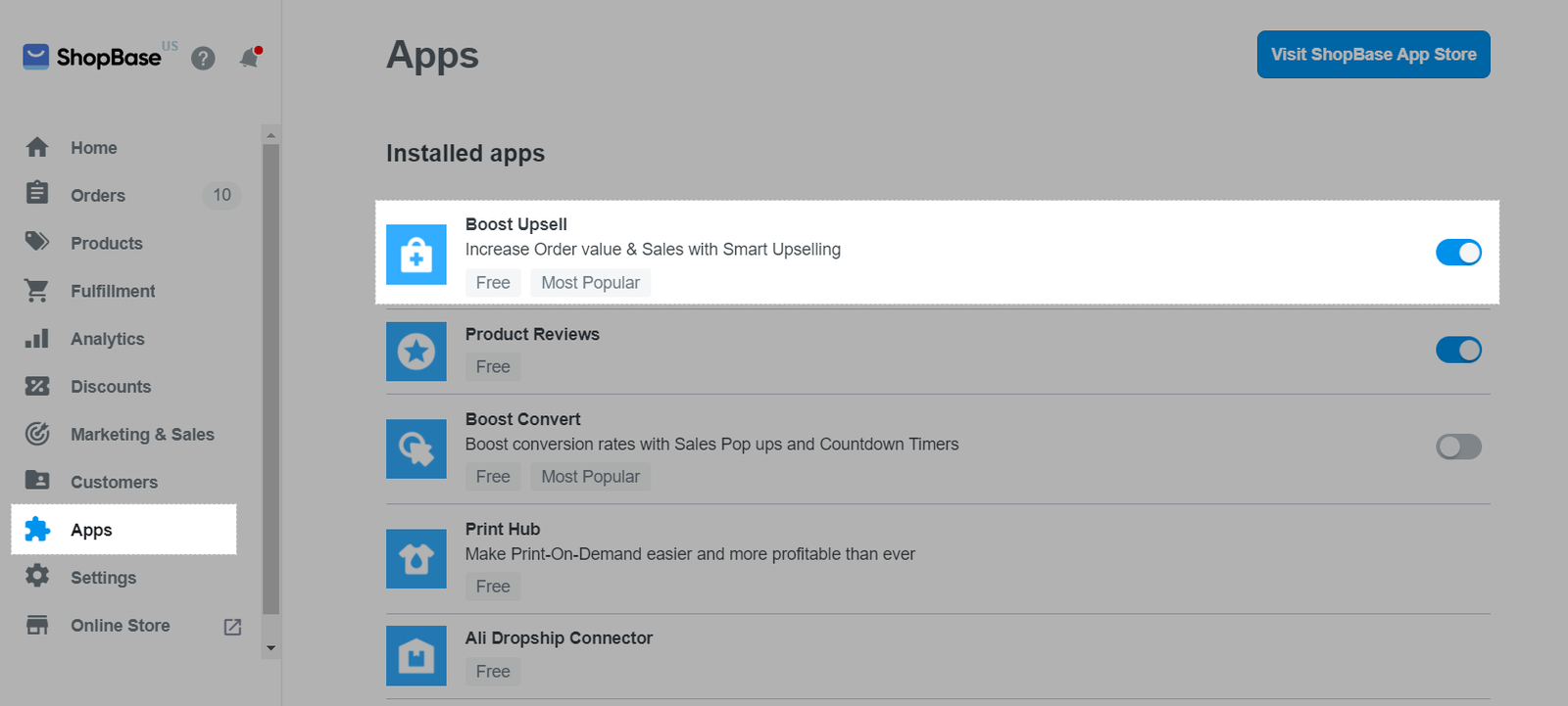 Tại trang quản trị ShopBase, đi tới Apps > Boost Upsell.