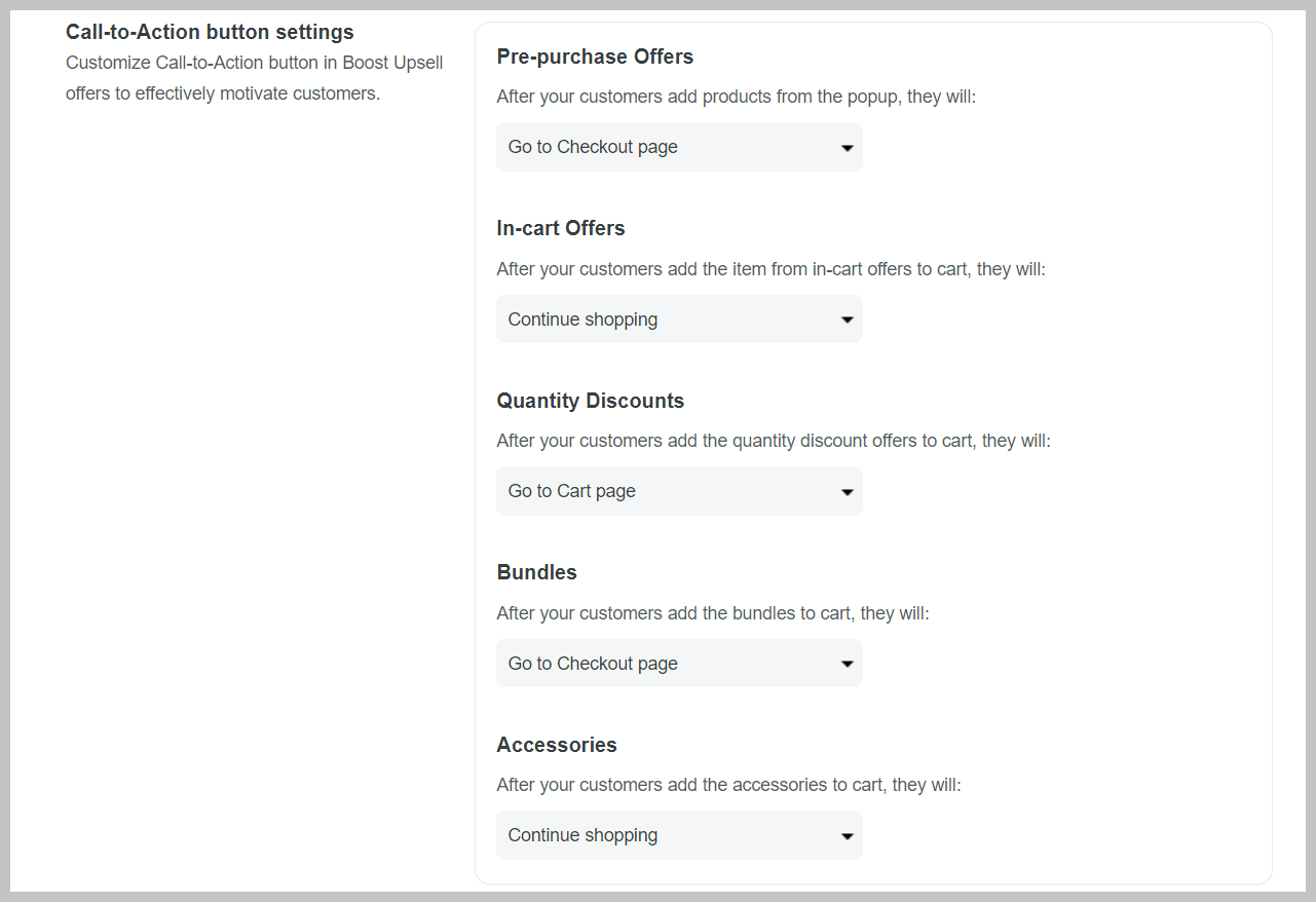 Sau khi khách bấm vào nút Add to cart để thêm các sản phẩm được gợi ý từ ứng dụng Boost Upsell vào giỏ hàng, hệ thống sẽ dẫn khách hàng tới một trang khác. Trong bài viết này, chúng tôi sẽ hướng dẫn bạn cài đặt trang đích mà bạn muốn dẫn khách hàng vào sau khi khách bấm nút Add to cart theo gợi ý mua hàng từ Bundles và Quantity Discounts.