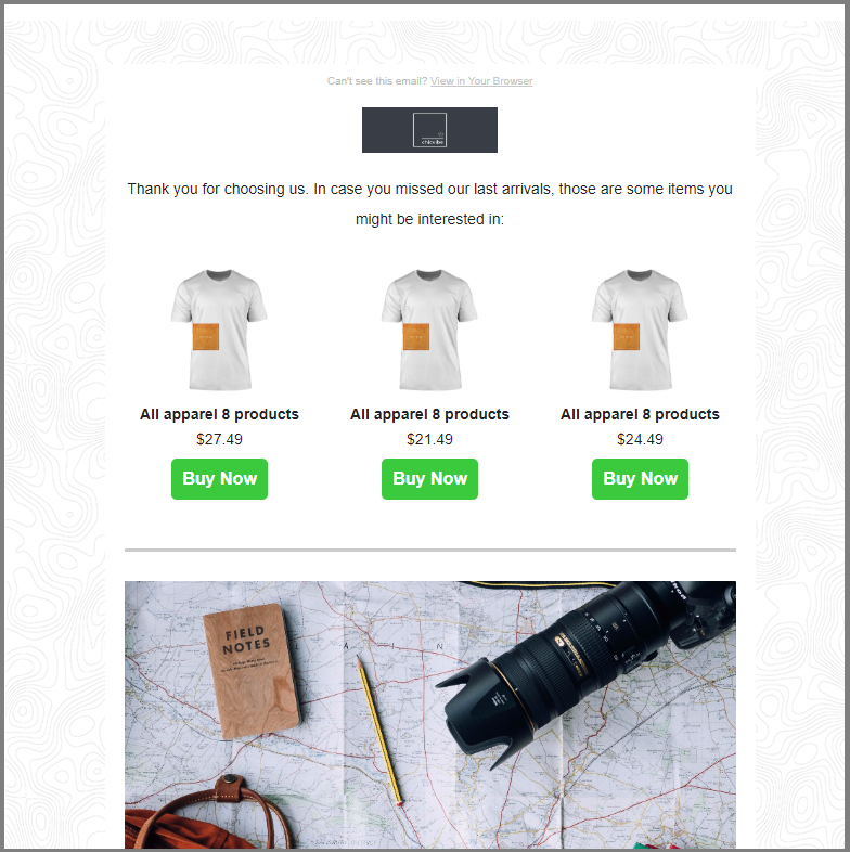 Klaviyo là một nền tảng tiếp thị qua email được các doanh nghiệp thương mại điện tử thường xuyên sử dụng vì có tính năng tự động hóa tiếp thị qua email và SMS mạnh mẽ. Cũng giống như Facebook và Google, Klaviyo cung cấp tính năng quảng cáo sản phẩm qua email, SMS và để sử dụng tính năng này bạn cần thêm nguồn cấp dữ liệu sản phẩm lên Klaviyo. Các sản phẩm được quảng cáo trong email của Klaviyo sẽ được hiển thị như hình dưới.