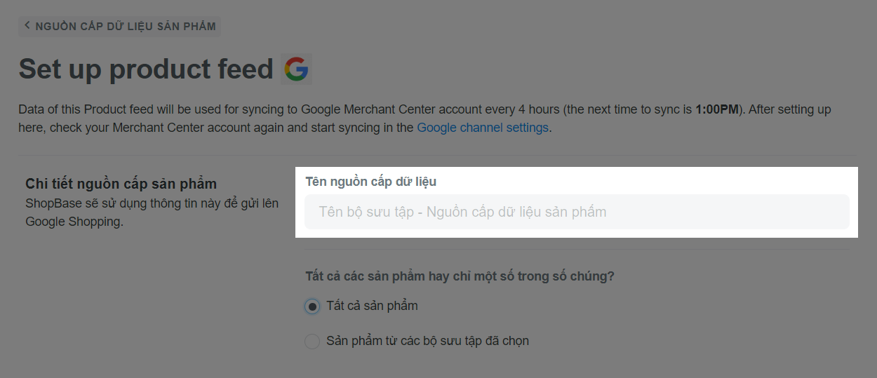 nguồn cấp sản phẩm nâng cao sử dụng phương pháp Content API, vì vậy sẽ không có URL nào được cung cấp cho nguồn cấp dữ liệu sản phẩm này. Thay vào đó, dữ liệu sản phẩm của bạn sẽ được tự động đồng bộ hóa với tài khoản Google Merchant Center đã kết nối với cửa hàng ShopBase.