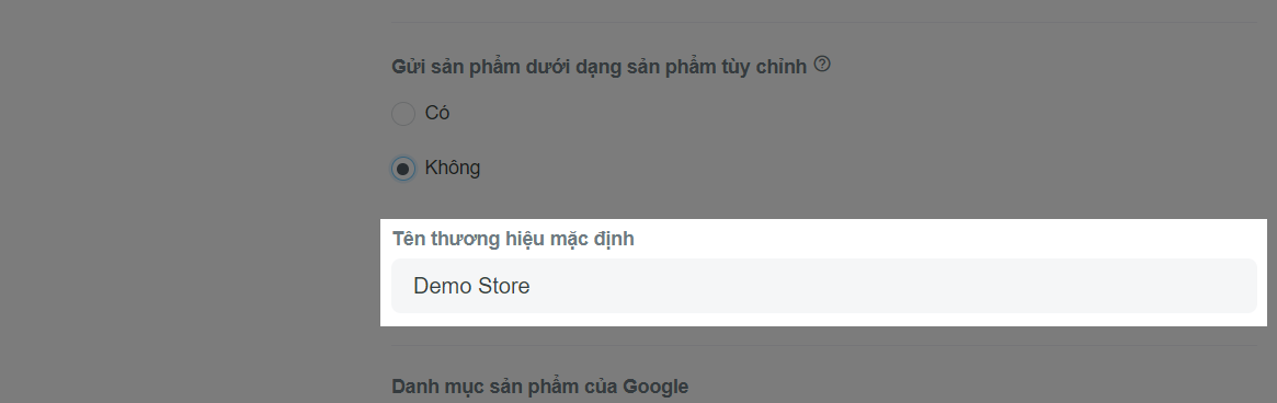 Tên thương hiệu mặc định sẽ là tên của nhà cung cấp sản phẩm. Nếu sản phẩm của bạn không có thông tin về nhà cung cấp, thì dữ liệu được nhập vào mục Tên thương hiệu mặc định (Default Brand Name) sẽ được đồng bộ lên GMC.