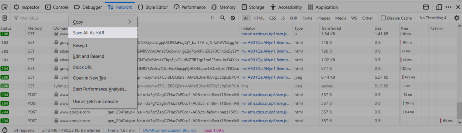 Lặp lại các thao tác trước đó đã gây ra lỗi, sau đó nhấp chuột phải và chọn Save All As HAR.