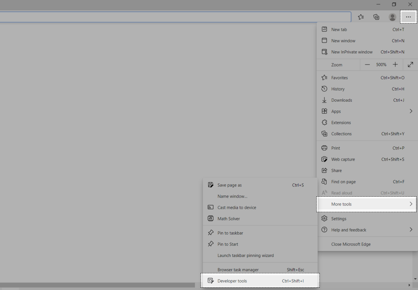 Trên trình duyệt Microsoft Edge, mở Edge Menu ở góc trên bên phải cửa sổ trình duyệt và chọn More Tools > Developer Tools. Bạn cũng có thể nhấp chuột phải vào vị trí bất kỳ trên màn hình và chọn Inspect, hoặc dùng tổ hợp phím CTRL + Shift + I.