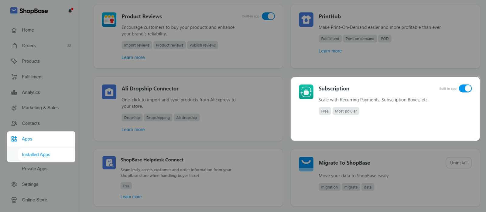 Trong trang quản trị cửa hàng, đi đến mục Apps > Installed Apps > bật và truy cập ứng dụng Subscription.