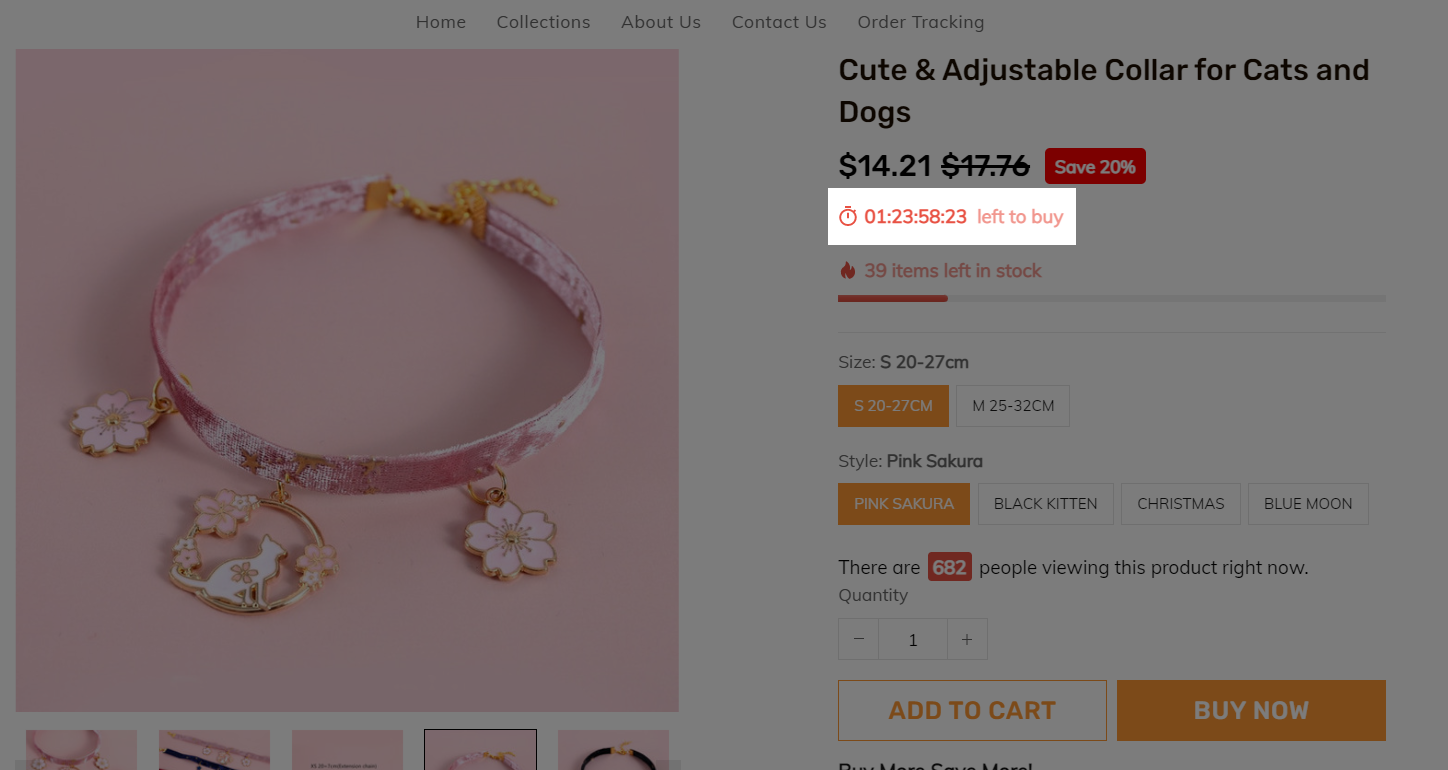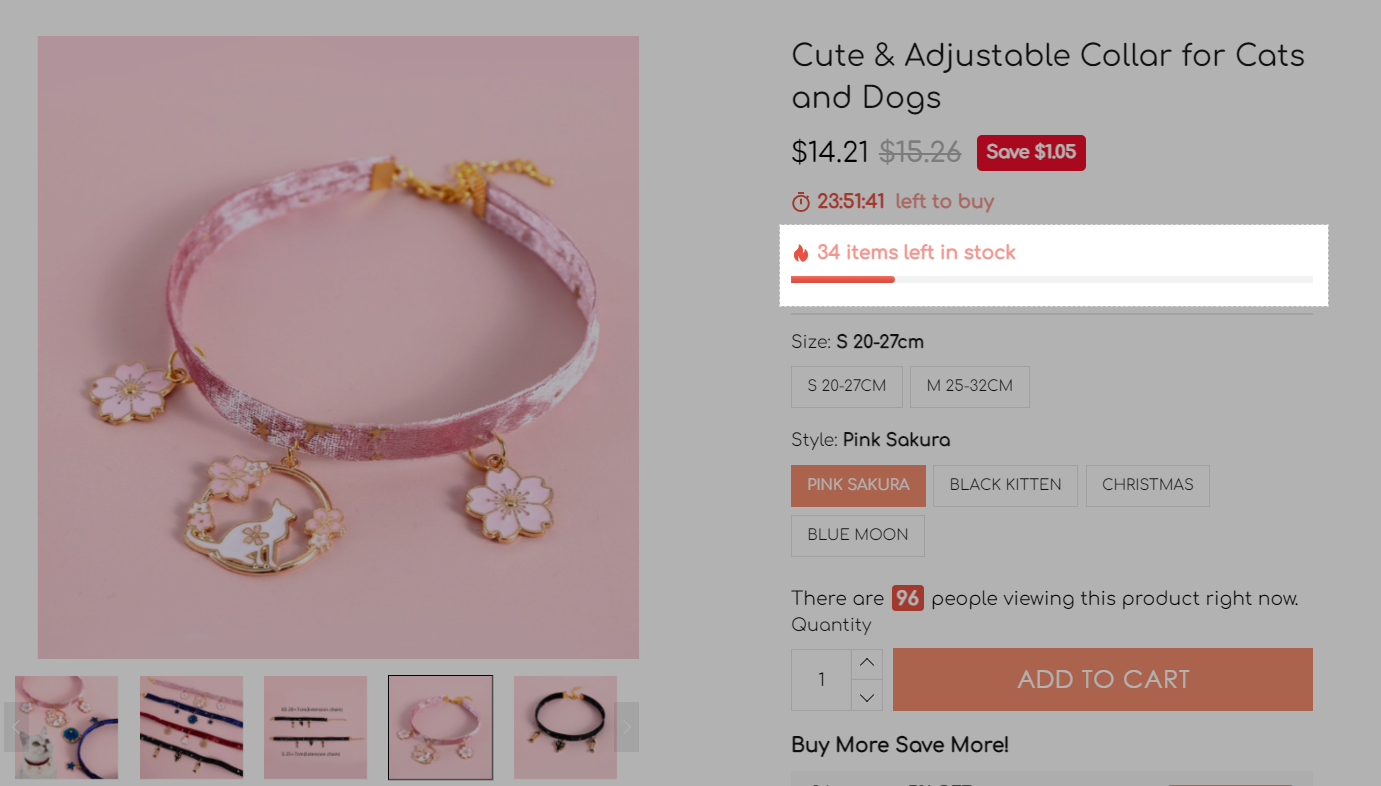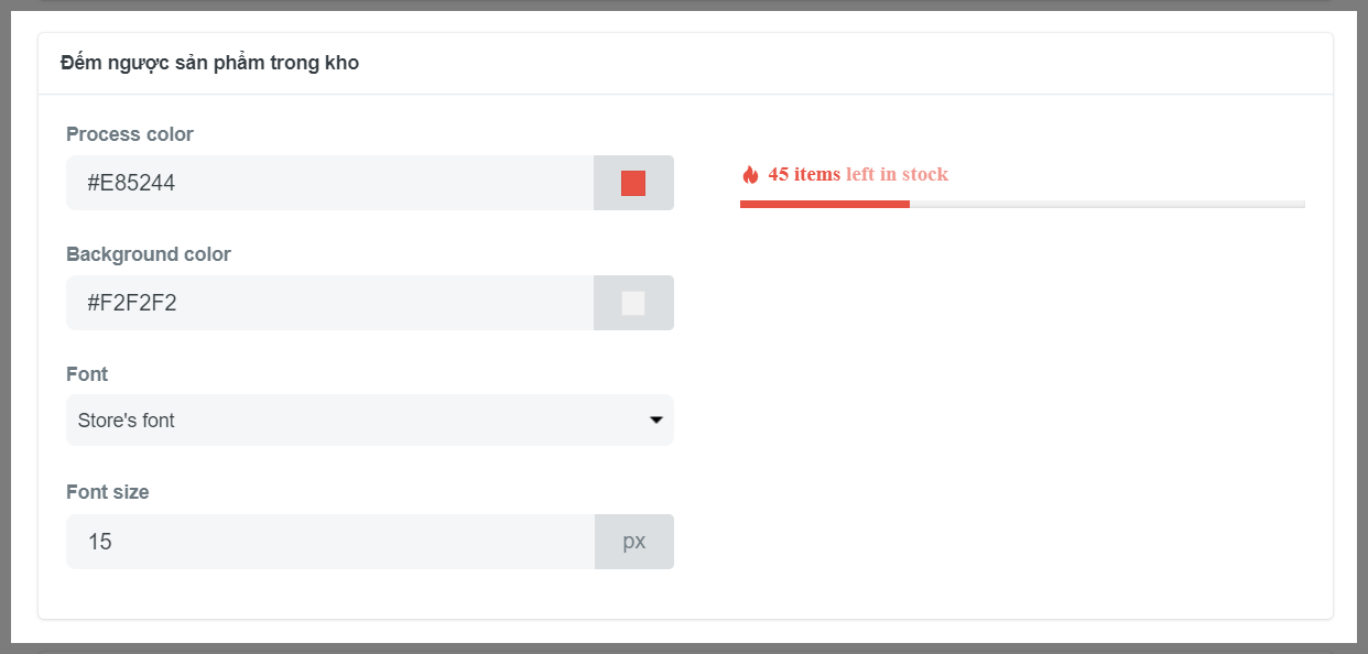 Khi được kích hoạt, tính năng này sẽ thêm một thanh tiến trình (progress bar) trên các trang sản phẩm của bạn để hiển thị số lượng sản phẩm còn lại trong kho. Bộ đếm ngược sẽ được hiển thị trên trang sản phẩm như bên dưới.