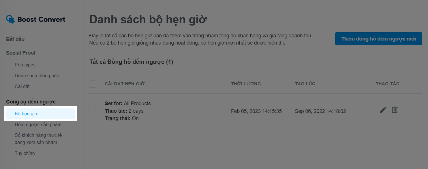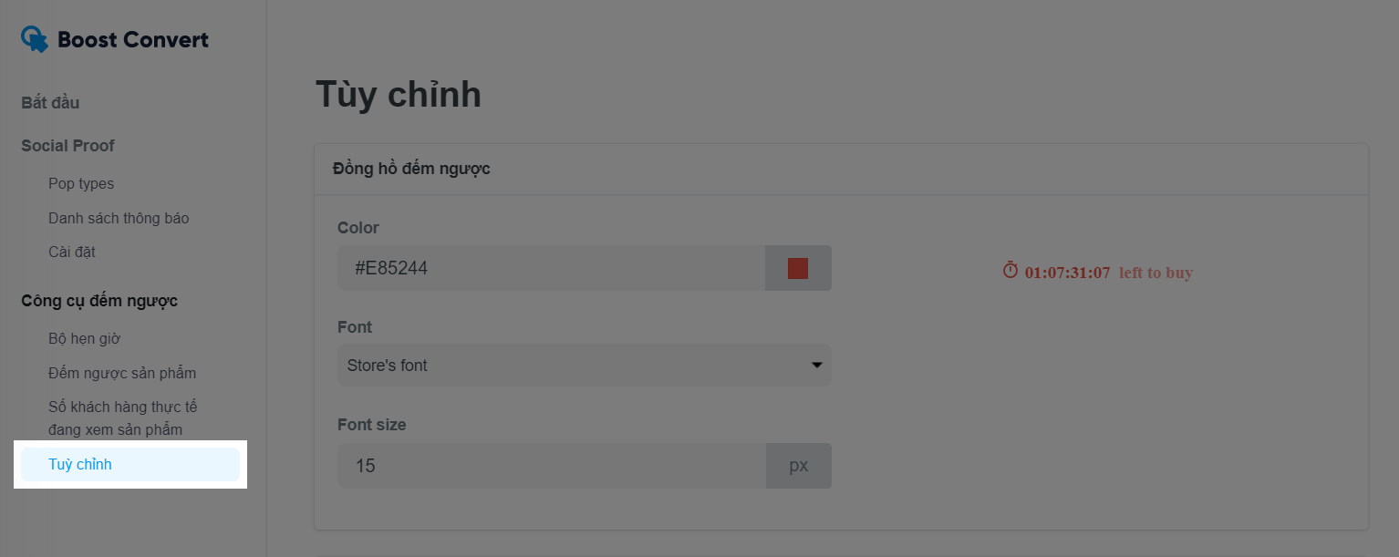 Có hai loại công cụ là: Bộ hẹn giờ (Timer countdown) và Đếm ngược sản phẩm (Product countdown). Trong bài viết này, chúng tôi sẽ hướng dẫn bạn sử dụng các công cụ đếm ngược của Boost Convert.