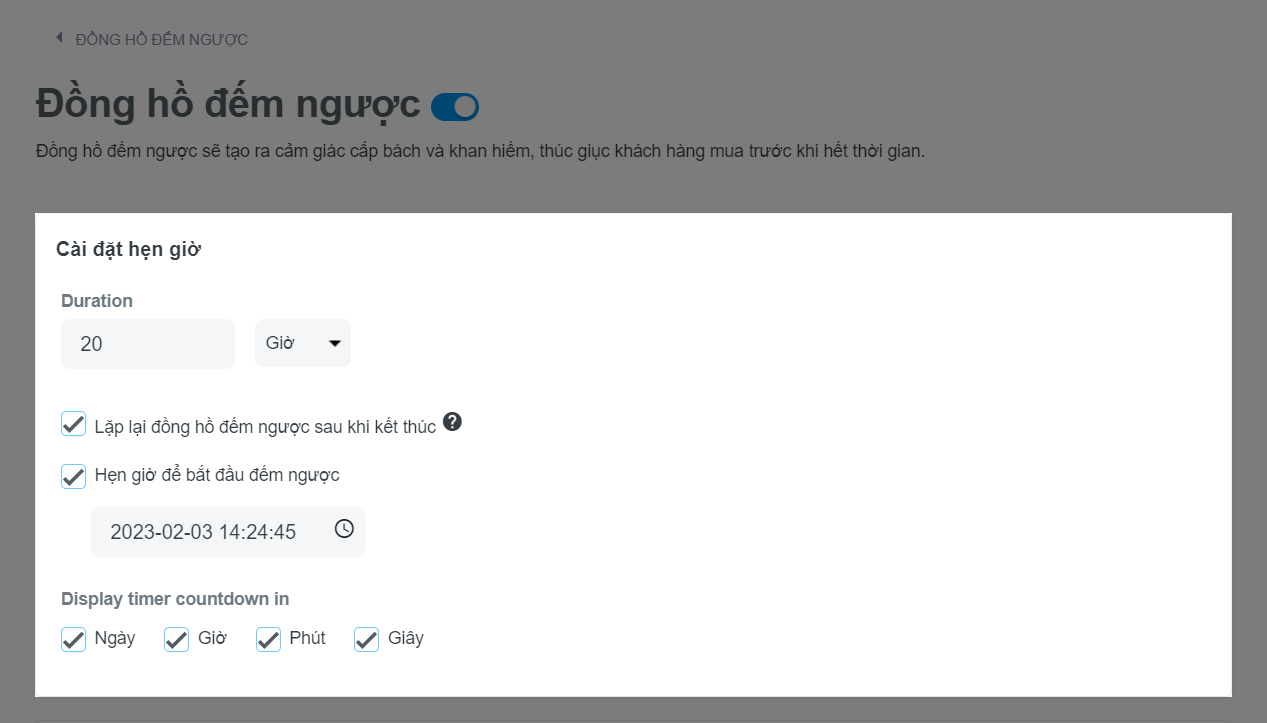 Lặp lại đồng hồ đếm ngược sau khi kết thúc (Repeat countdown timer after it ends): Nếu bạn chọn mục này, bất cứ khi nào đồng hồ hết giờ, bộ hẹn giờ sẽ tự động lặp lại. Việc bắt đầu hẹn giờ sẽ dựa trên thời gian truy cập lần đầu tiên của khách hàng. Nếu bạn bỏ chọn mục này, sau khi đồng hồ đếm đến 0, nó sẽ biến mất khỏi cửa hàng của bạn.
