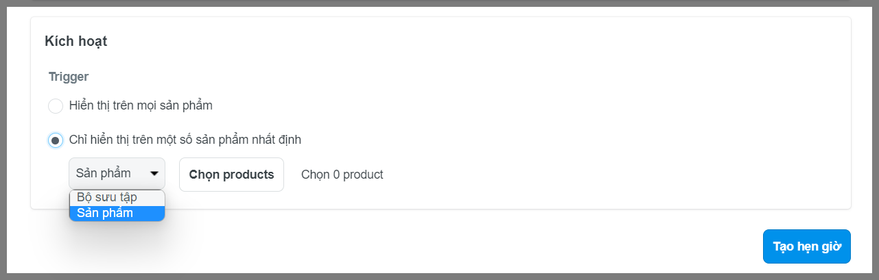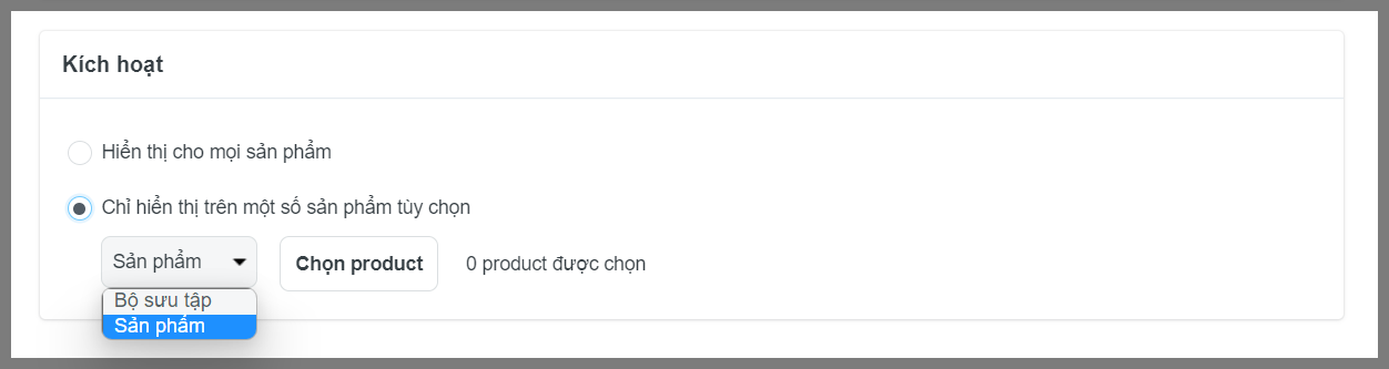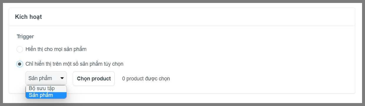 Trong mục Kích hoạt (Trigger), chọn Hiển thị trên mọi sản phẩm (Show in all products) hoặc Chỉ hiển thị trên một số sản phẩm nhất định (Show for some products I specify). Bạn cũng có thể chọn một số sản phẩm cụ thể hoặc một số sản phẩm trong bộ sưu tập cụ thể bằng cách nhấp vào Chọn sản phẩm/bộ sưu tập (Select products/collections).