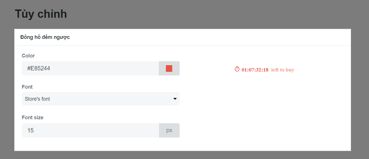 Nhấp vào Tùy chỉnh (Customize) ở cột bên trái bàn hình dưới Bộ hẹn giờ (Timer Countdown) và Product Countdown để thay đổi giao diện hiển thị của đồng hồ đếm ngược.