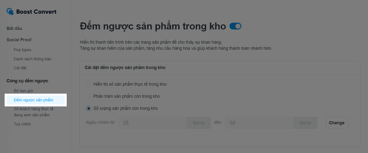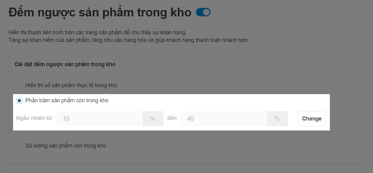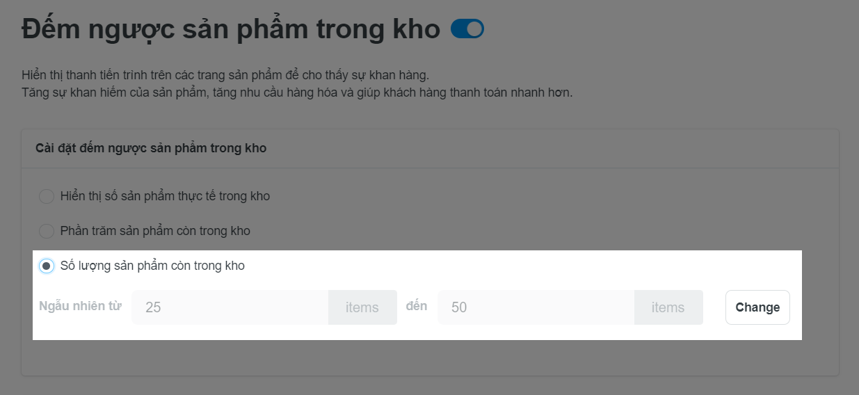 Số lượng sản phẩm còn trong kho (Number of items left in stock): Để hiển thị số lượng sản phẩm trong kho với các giá trị thay đổi do bạn lựa chọn. Nhấp vào Change để chỉnh sửa các giá trị.