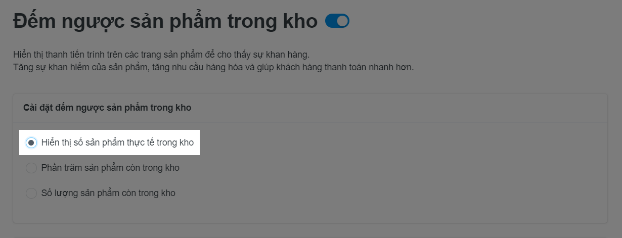 Hiển thị số sản phẩm thực tế trong kho (Show your actual number of stocks): Đánh dấu tích để chọn lựa chọn này nếu bạn muốn hiển thị số sản phẩm thực tế còn lại trong kho.