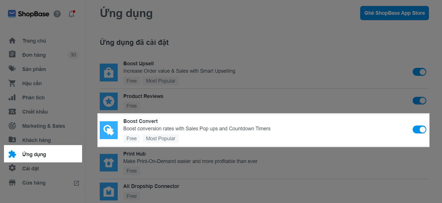 Tại trang quản trị ShopBase, đi tới Ứng dụng (Apps) > Boost Convert. Bạn cũng có thể truy cập vào ứng dụng Boost Convert bằng cách đi tới Marketing & Sales > Boost Convert.