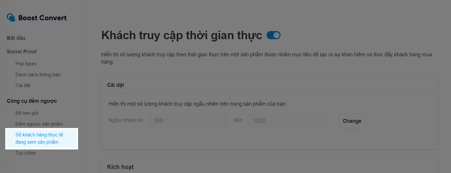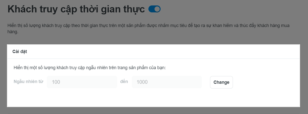 Trong mục Cài đặt (Settings), nhấp vào Change để chỉnh sửa giá trị. Số lượng khách truy cập vào trang sản phẩm sẽ được chọn ngẫu nhiên từ các giá trị bạn nhập vào đây.