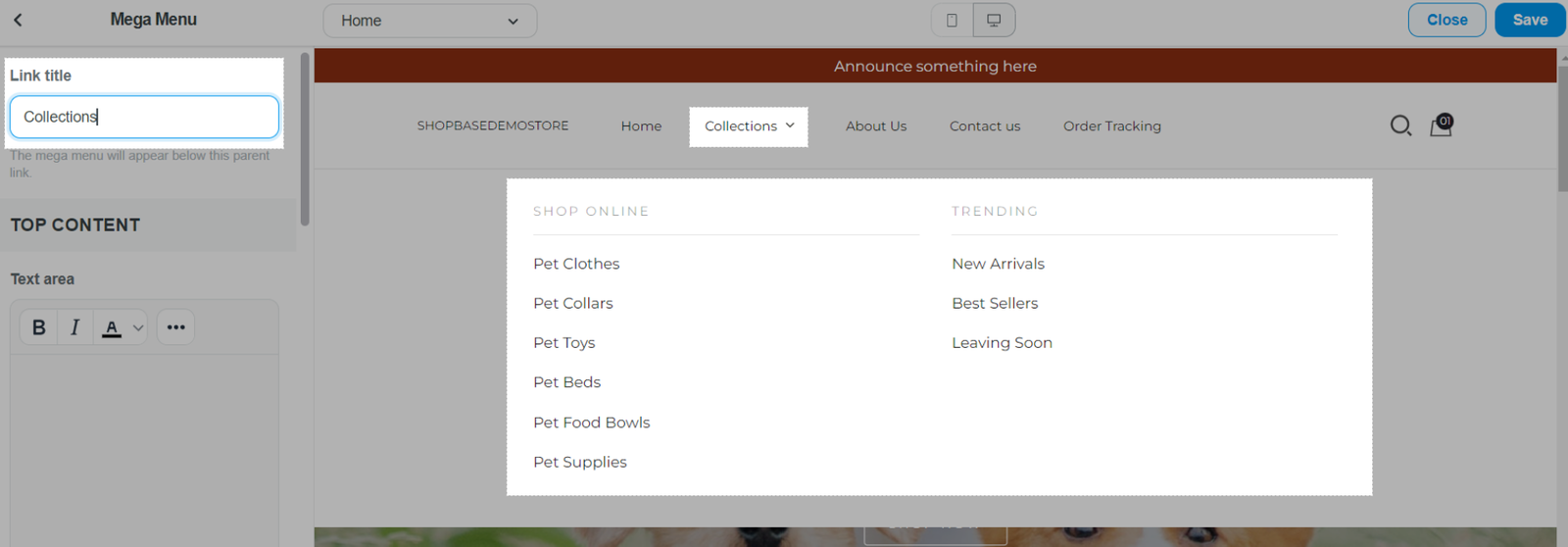Mục Content cho phép tùy chỉnh nội dung trong các mục cụ thể của mega menu như Top Content, Navigation, và Bottom Content. Nội dung trong các mục này đều không bắt buộc và bạn có thể xóa để bỏ qua nếu muốn.