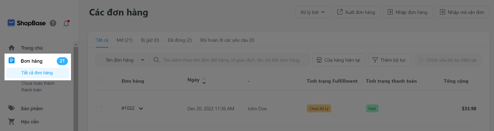 Việc xử lý đơn hàng theo cách thủ công là việc thực hiện các thao tác trên hệ thống quản trị cửa hàng để hệ thống ghi nhận bạn đã xử lý đơn hàng và cho phép bạn gửi thông tin về việc vận chuyển (ví dụ: mã vận đơn) cho khách hàng. Xử lý đơn hàng thủ công khác với xử lý đơn hàng bằng các ứng dụng Ali Dropship Connector, PlusHub, PrintHub ở chỗ khi bạn chọn xử lý đơn hàng qua các ứng dụng ShopBase cung cấp, ShopBase sẽ giúp bạn kết nối với nhà cung cấp để họ sản xuất và vận chuyển đơn hàng tới khách hàng. Ngược lại, nếu bạn xử lý đơn hàng theo cách thủ công, bạn phải tự sản xuất, đóng gói, vận chuyển hoặc tìm một nhà cung cấp bên ngoài để làm những việc đó trước khi gửi thông tin lên hệ thống là đã hoàn thành việc xử lý đơn hàng. Phương pháp xử lý đơn hàng này chỉ có thể thực hiện với từng đơn hàng lẻ. Ngoài ra, bạn có thể thực hiện xử lý nhiều đơn hàng cùng một lúc bằng tệp CSV.