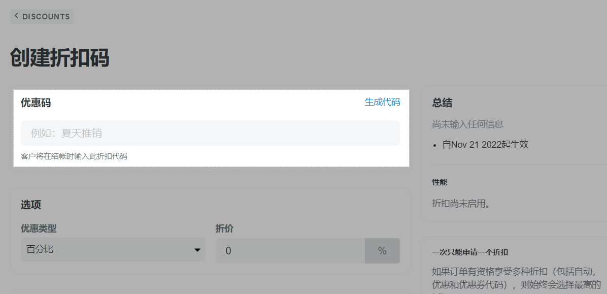 系统将指向您到折扣创建页面。在 折扣代码 字段中,请输入折扣代码,或单击 创建代码,以系统创建新代码。当客户在结帐页面上输入此代码时,折扣代码将应用于客户的购物车。
