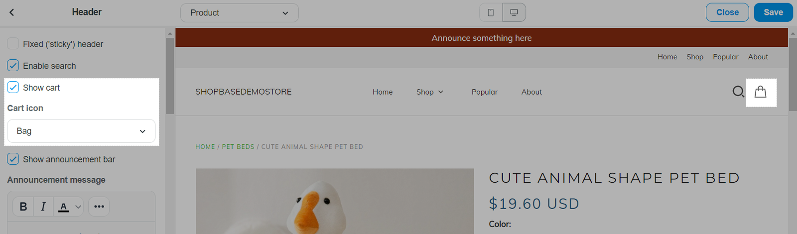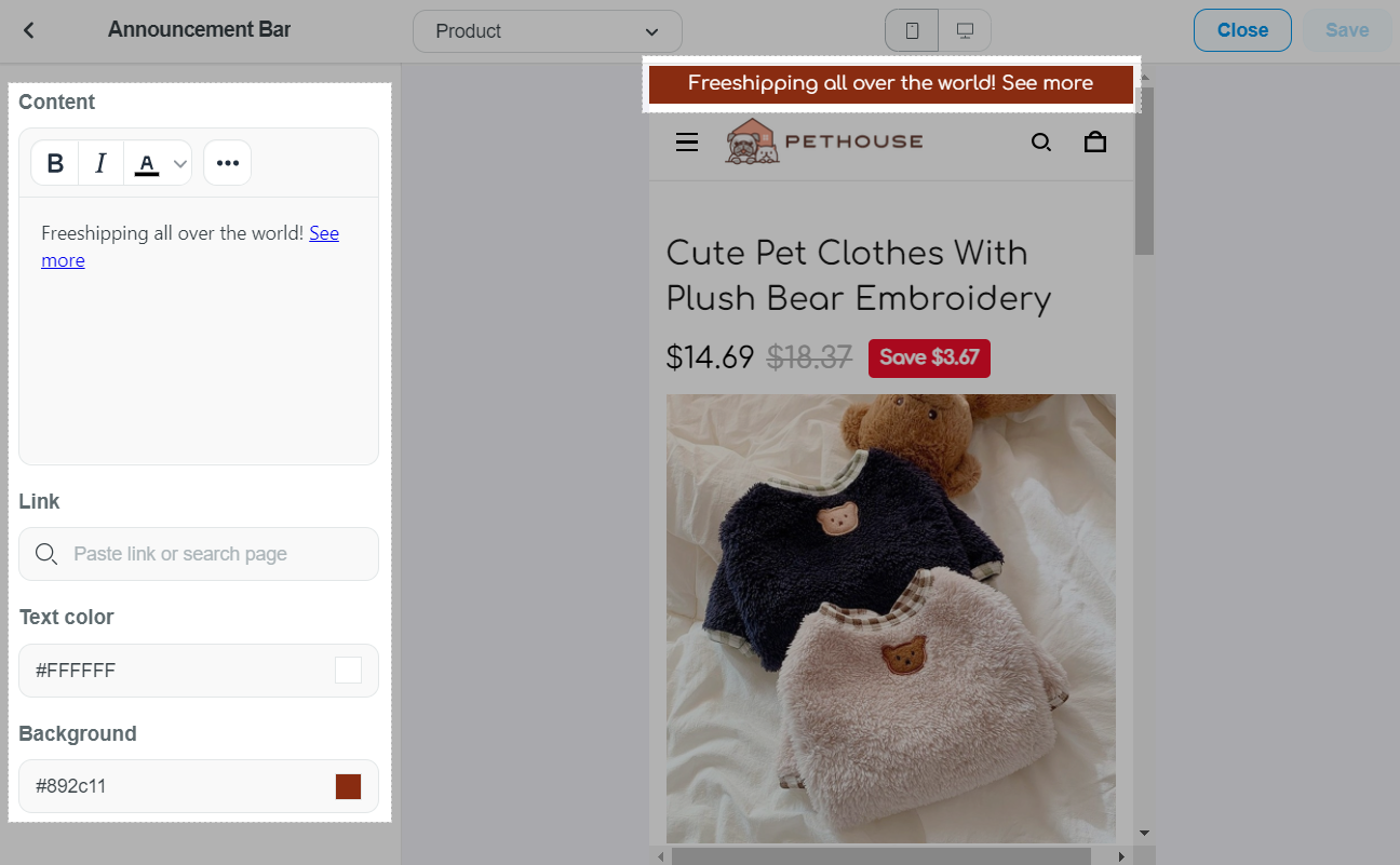 您可以启用公告栏。此栏将显示为页头顶部的标语。这是向客户展示折扣代码或重要信息的好方法。文本框有多个选项,包括粗体、斜体、插入图片和向文本添加链接。如果将文本框留空,公告栏将消失。