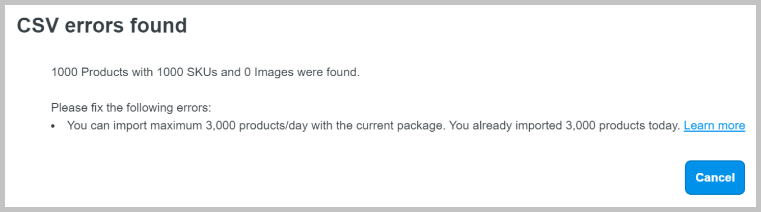 当每天导入的产品数量达到限制时,错误通知将如下在商店中显示: