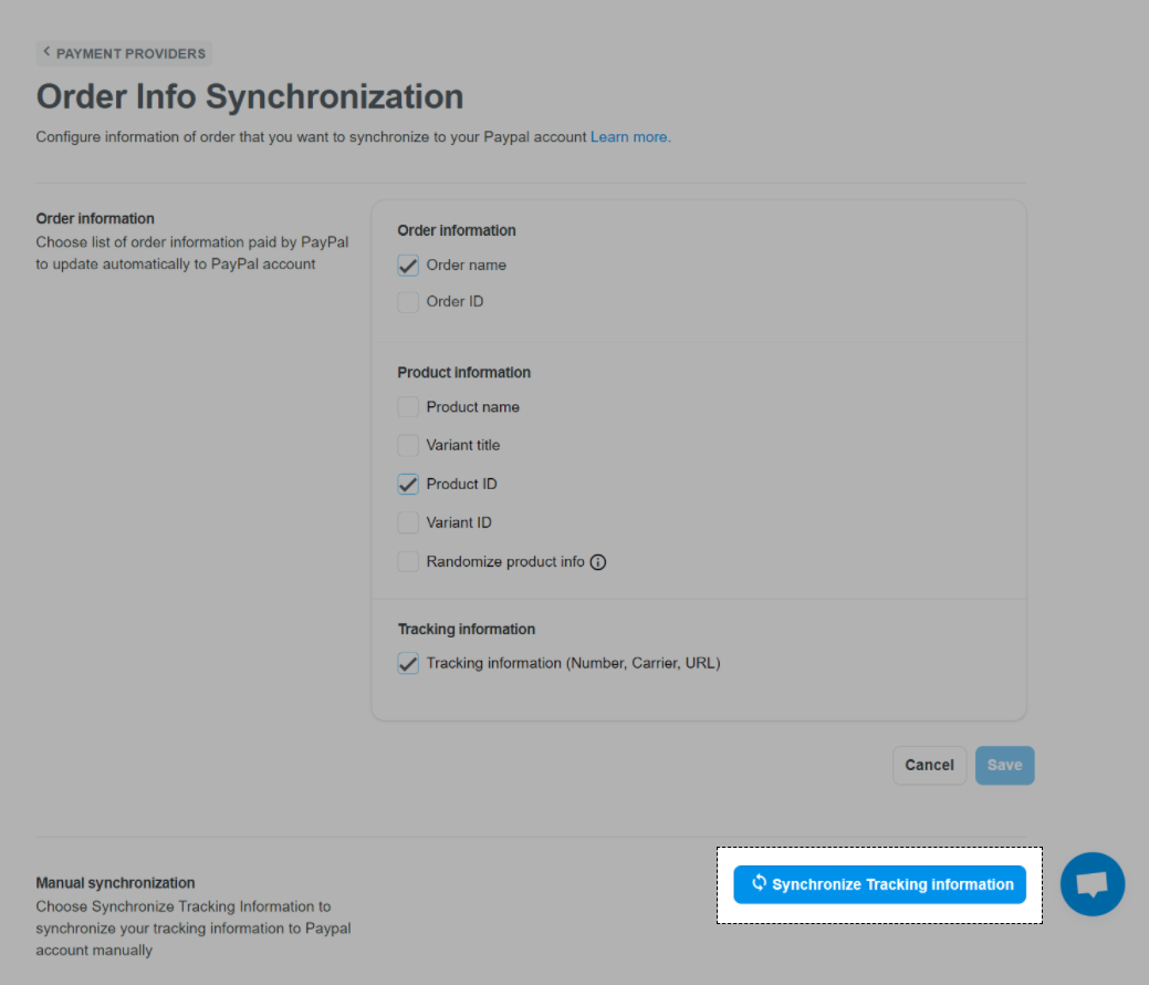 在 手动同步部分中,单击 同步跟踪信息按钮以将您的跟踪代码重新同步到PayPal仪表板。