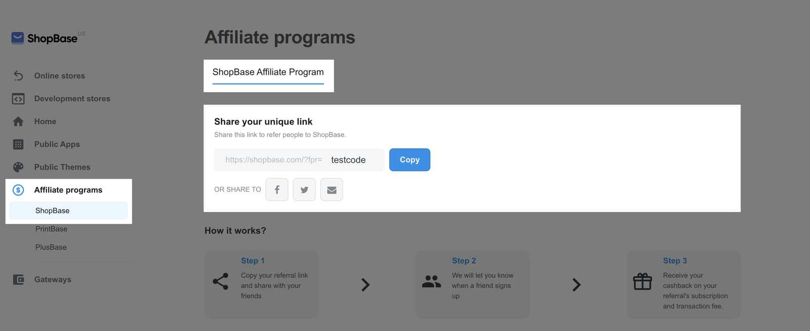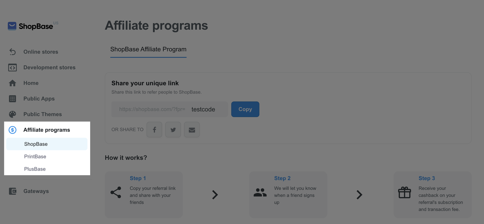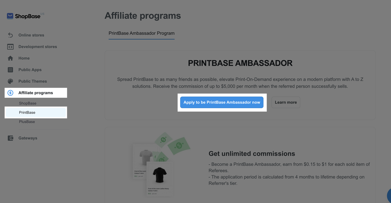 ShopBase 目前提供三个活动——ShopBase Affiliate、PrintBase Ambassador 和 PlusBase Ambassador。